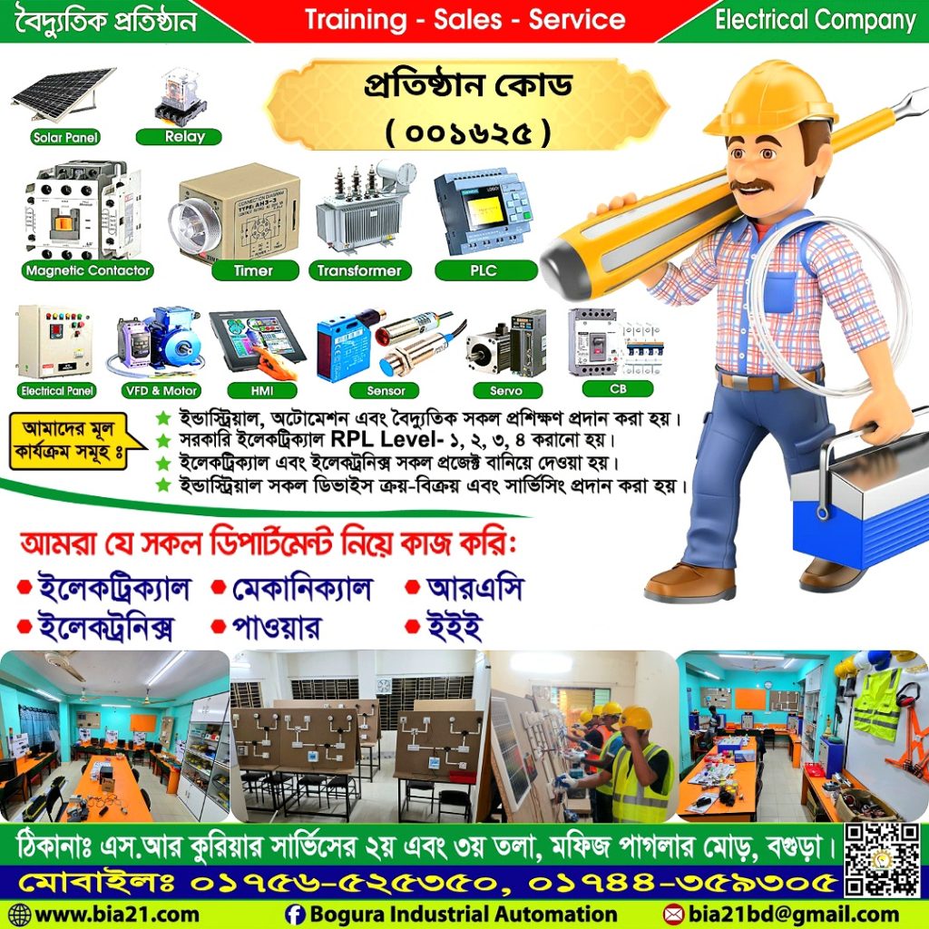 বাংলাদেশ সরকার এর জাতীয় দক্ষতা উন্নয়ন কর্তৃপক্ষ (NSDA) এবং কারিগরি শিক্ষা অধিদপ্তর (DTE) অনুমোদিত প্রতিষ্ঠান হিসেবে→“বগুড়া ইন্ডাস্ট্রিয়াল অটোমেশন” ২০২১ সাল হতে বৃহৎ পরিসরে সফলতার সঙ্গে উত্তরবঙ্গের শ্রেষ্ঠ ট্রেনিং সেন্টার হিসেবে Electrical, Industrial, Automation, Electronics, Mechanical, Power ছাড়াও বর্তমানে আরো নানাবিধি বিষয়ে কারিগরি প্রশিক্ষণ প্রদান করে আসছে এবং পাশাপাশি প্রতিষ্ঠানের এক ঝাঁক সুদক্ষ ইন্ডাস্ট্রিয়াল অটোমেশন ইঞ্জিনিয়ার থাকায়,উত্তরবঙ্গের সকল ইন্ডাস্ট্রি ফ্যাক্টরিতে যেকোনো মেশিনের সার্ভিস প্রদান করে আসছে।